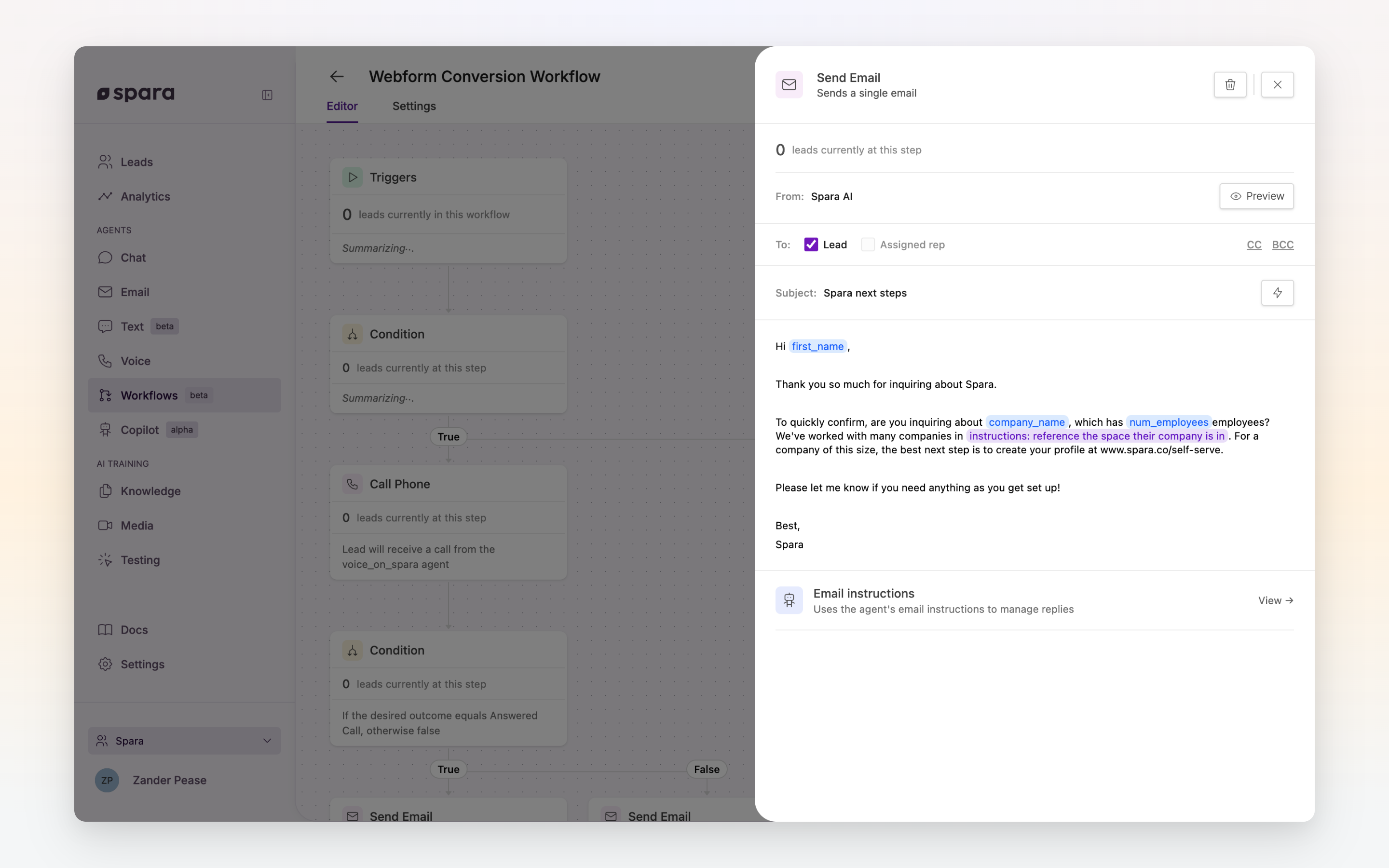 Both the subject line and body support [variables](https://github.com/spara-ai/spara-app/blob/gitbook/gitbook/documentation/agents/workflows/using-variables.md). Use the **Insert menu** (⚡) to browse and insert available lead data fields.